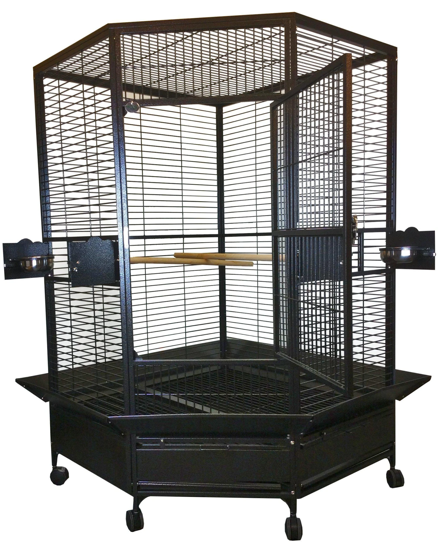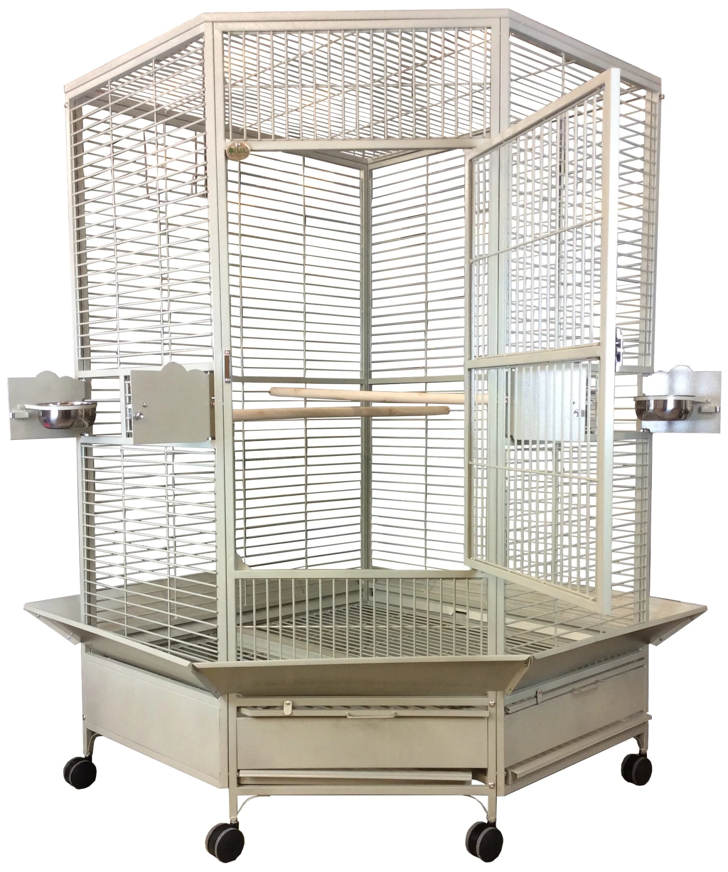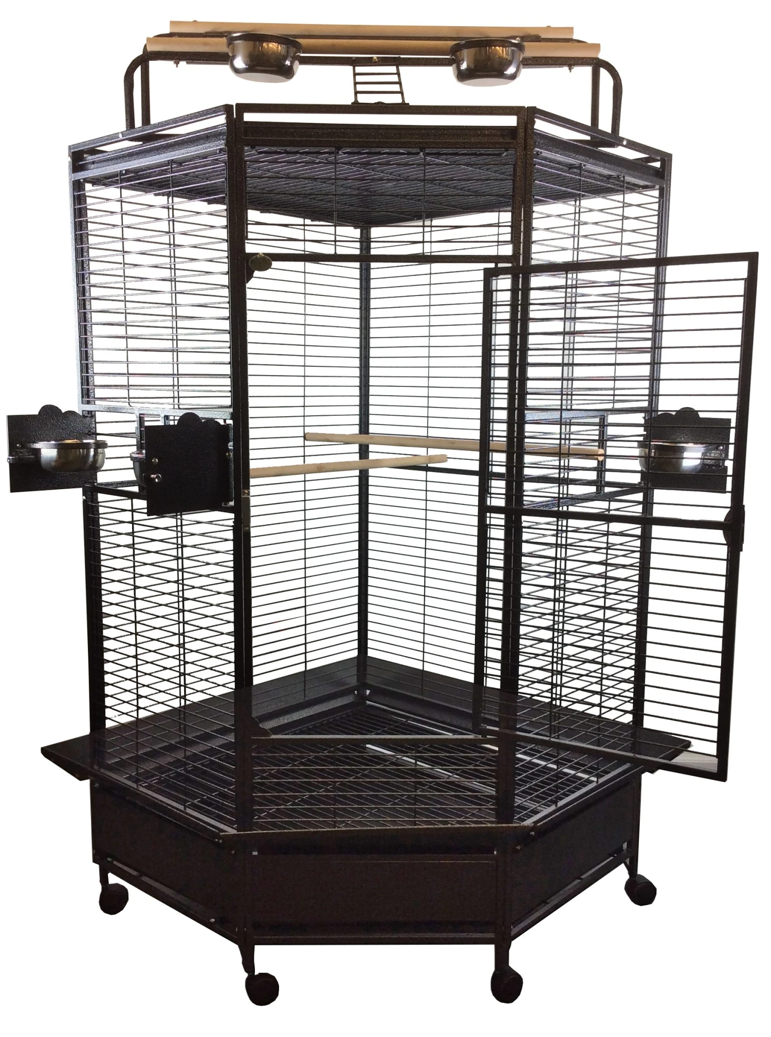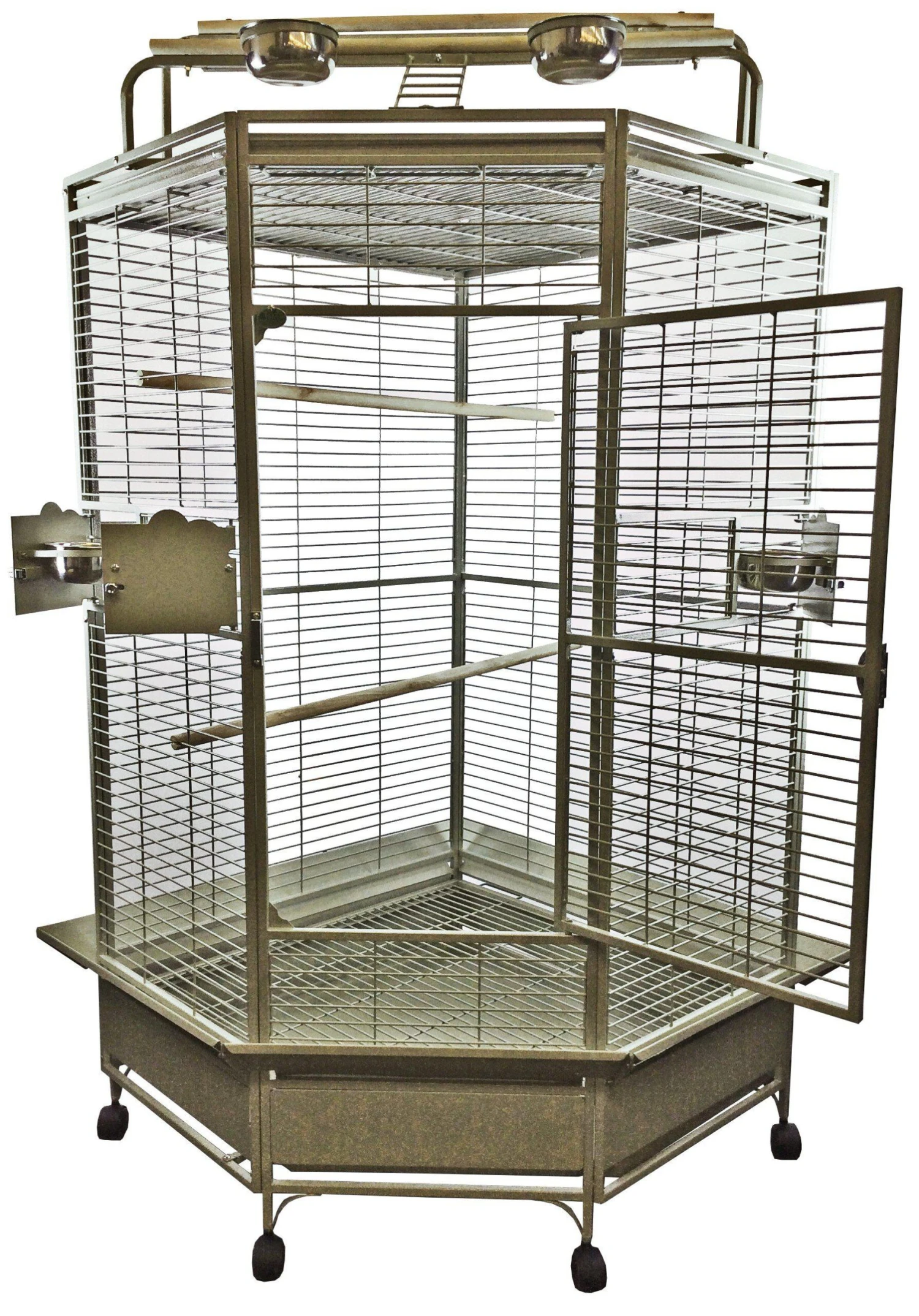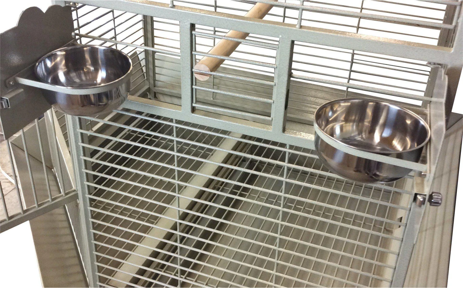 โข 3 stainless steel feeder cups & 2 perches