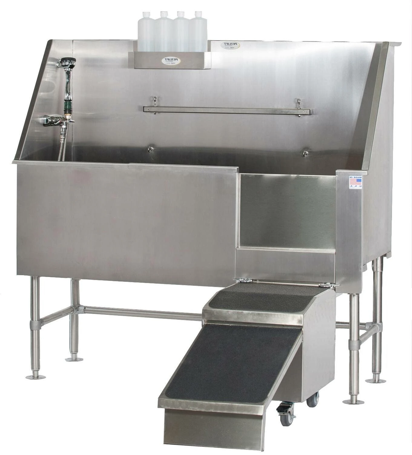 The tub is fabricated heavy 16 gauge 304 stainless steel tub that is fully welded, with no caulk. Cove molded edges increase tub wall integrity. Its fine craftsmanship allows for easy walk-in ability for larger animals with a convenient ramp that extends and withdraws into the face of the tub. Both the pull-out ramp and the slide-away stainless steel door allow easy access, but even more so, can be operated with one hand allowing the groomer to safely and efficiently handle each pet.