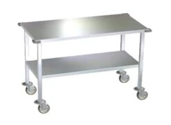 This NSF Approved mobile gurney and supply table is constructed of heavy duty 16 gauge 304 stainless steel and includes a welded undershelf. The legs are constructed of 1.5″ square stainless steel tubing with rolling bumpers and NSF Approved heavy duty 5″ diameter swivel casters, two of which have locking brakes. The undershelf surface height is 18″ from the floor.