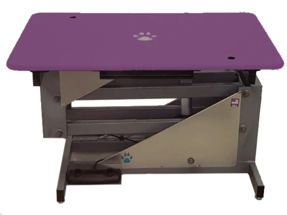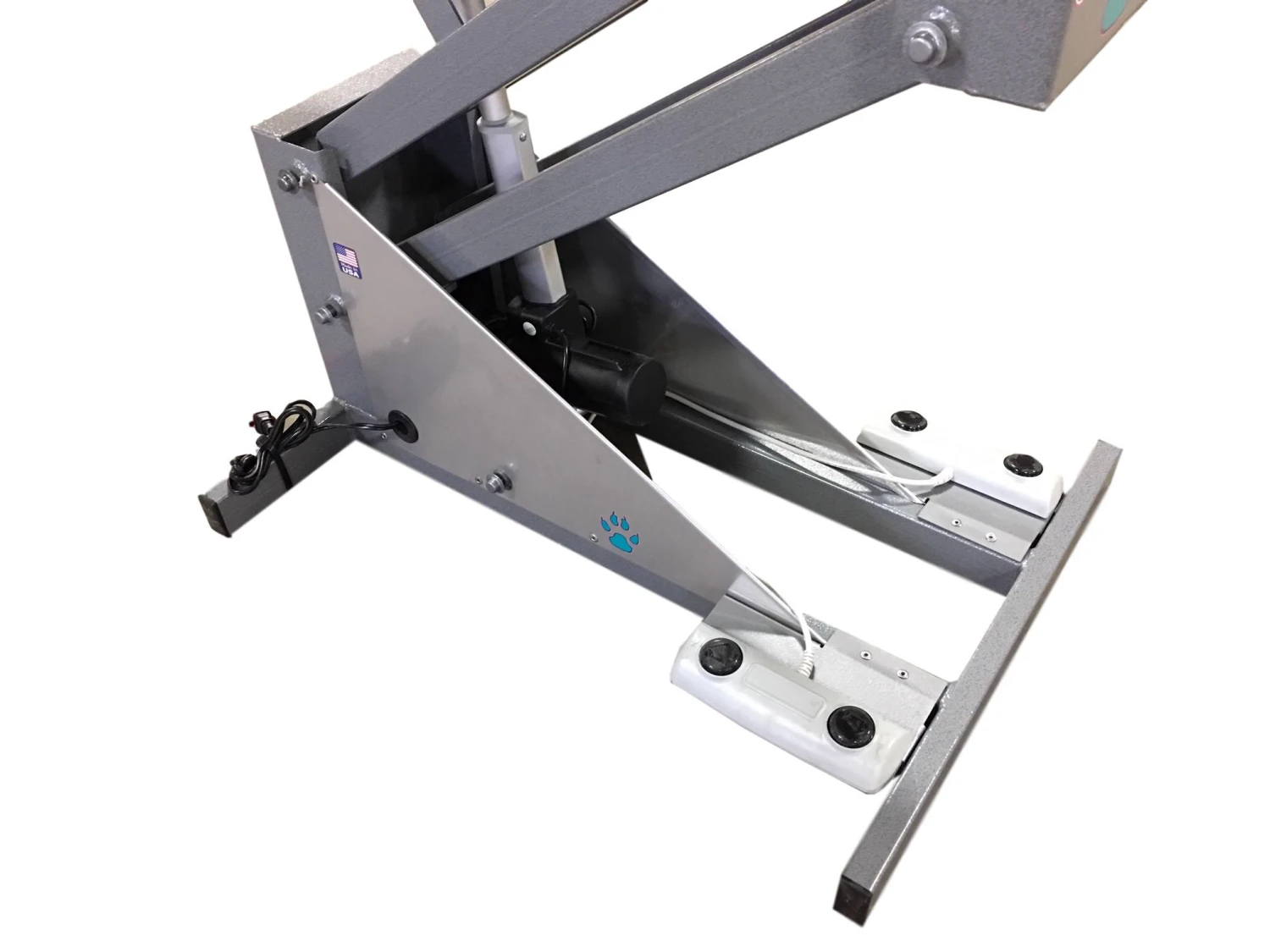 The frame is powder coated in a sleek charcoal grey and is accented with stainless steel and turquoise paw prints. The table top is sprayed with a non-skid textured sealant and includes two scissor holes and two clipper blade holders that are mounted under the table top. Steel-reinforced for maximum strength and durability, the table top can also be sprayed in a color to match your decor! The electric pump offers a quiet and smooth up-down motion and includes a foot pedal on both sides. Includes 4 adjustable leg levelers.