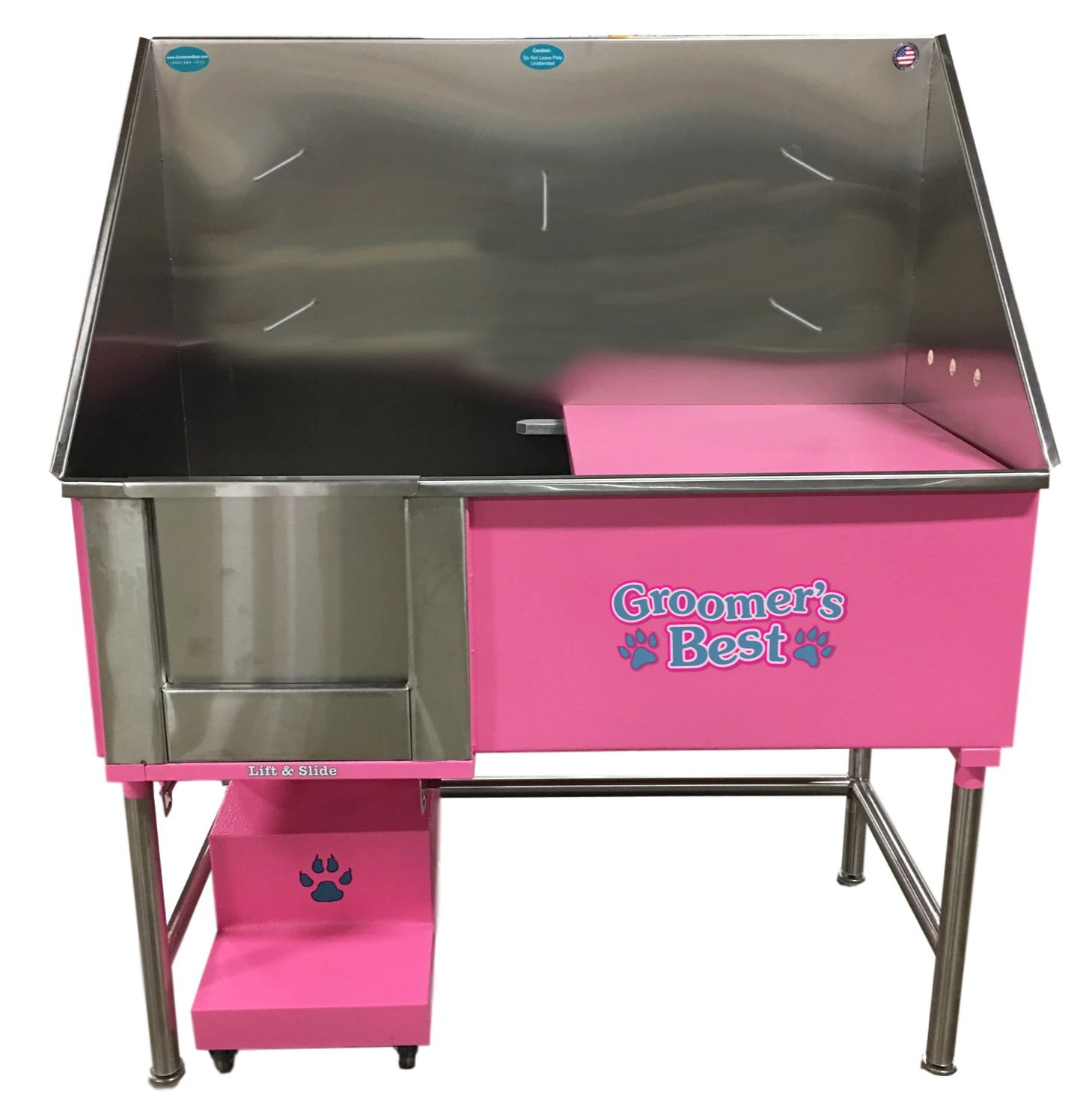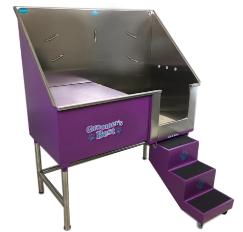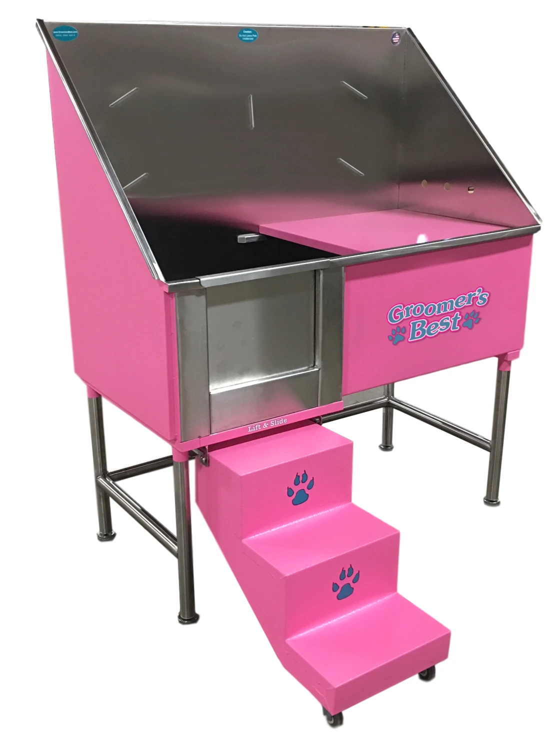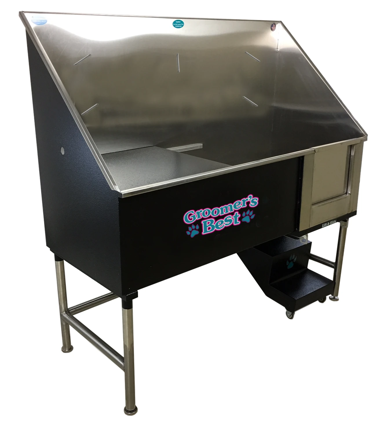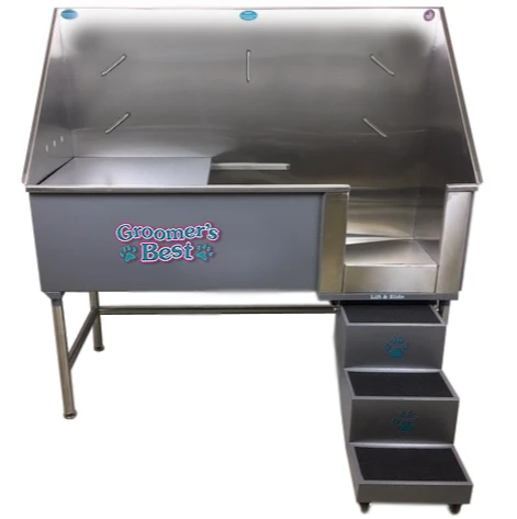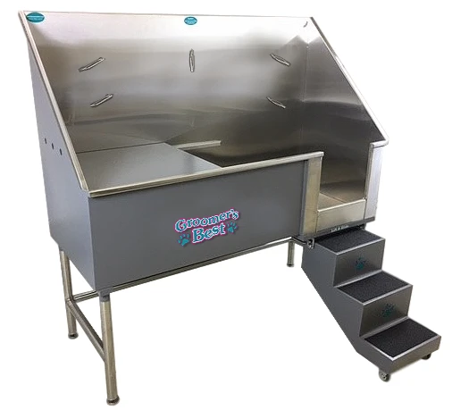 The Groomer’s Best Stainless Steel Elite Dog Grooming Bath Tub is fully welded and constructed of 18 gauge 304 polished stainless steel, double sealed to prevent leaking, and can hold over 350 pounds.