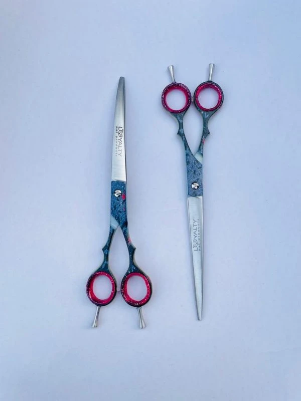 This limited edition 2 piece set features a 8″ straight and a 8″ curve shear set made from handcrafted 420c steel. In all transparency and honesty, as they strive to be with their amazing customers, They normally only produce Japanese 440c steel, but in order for them to keep costs down on these extremely limited edition shears, they had to drop down the steel level. Still sharp, the 420c steel blades will dull a bit faster, but still a solid cut. The handles feature a stellar pattern with a special glimmer added to it in a complicated secondary process to add that special feature all on its own.