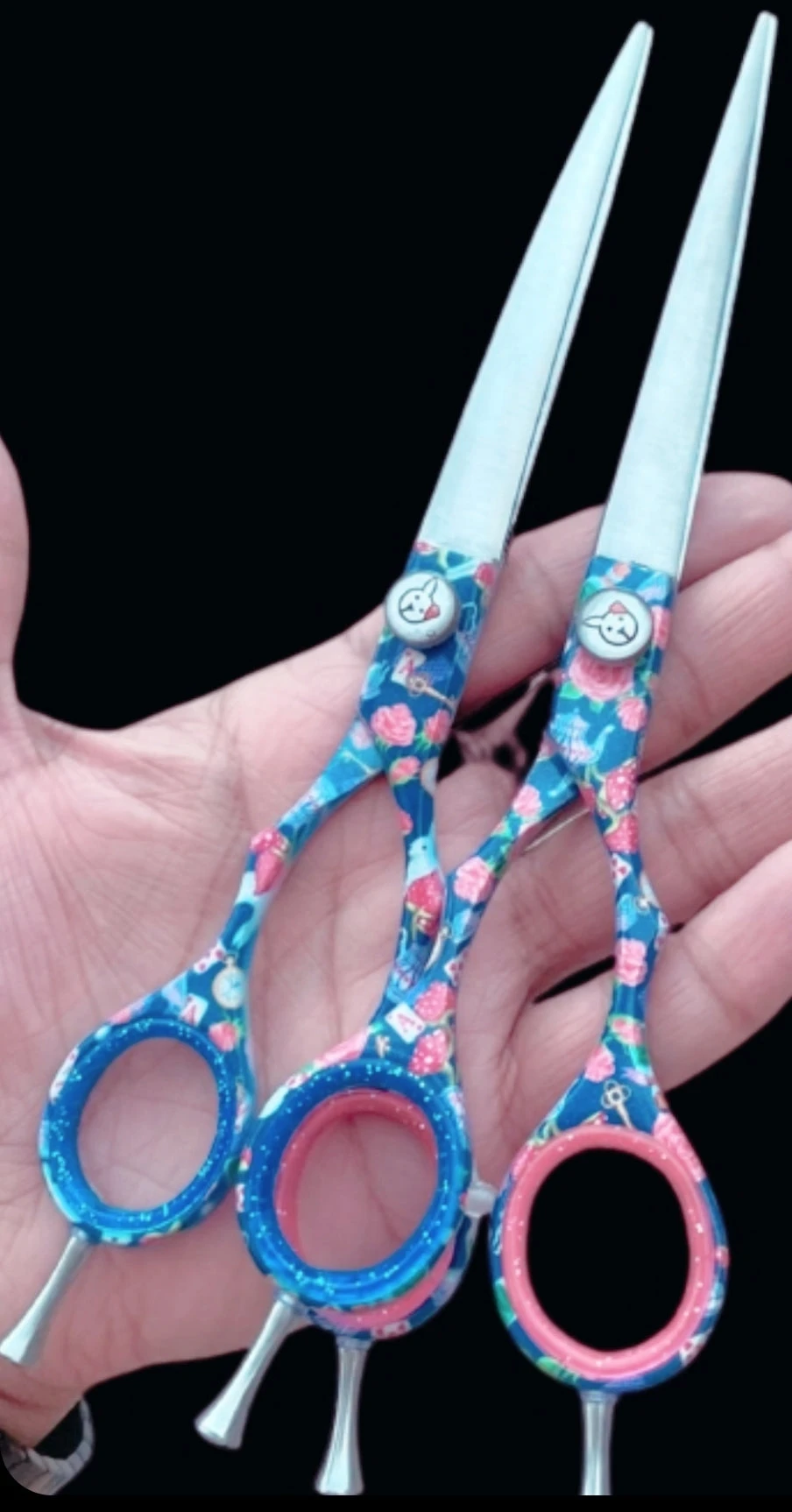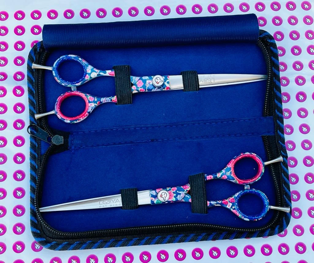 This limited edition 2 piece set features a 7.5″ straight and a 7.5″ curve shear set made from handcrafted 420c steel. In all transparency and honesty, as we strive to be with our amazing customers, We normally only produce Japanese 440c steel, but in order for us to keep costs down on these extremely limited edition shears, we had to drop down the steel level. Still sharp, the 420c steel blades will dull a bit faster, but still a solid cut. The handles feature a stellar pattern with a special glimmer added to it in a complicated secondary process to add that special feature all on its own.