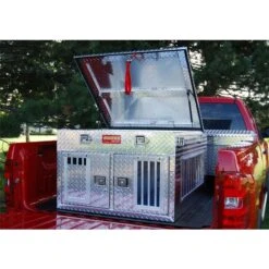 Diamond-tread aluminum gives you a lifetime of rust-free service in a box that’s strong yet lightweight. Dog compartments feature corrugated liners to insulate and cushion your dog while protecting his coat from dark marks. He’ll get good air flow through the side vents and door vents. The compartment divider also has vent holes. Gas struts easily lift the storage lid and securely hold it open. Removable sliding storm covers protect dogs from bad weather or unwanted attention. Lockable slam latch doors let you secure your dog, while flush mounted latches prevent snagging. The new rattle-free spring-loaded handles make transport easy.