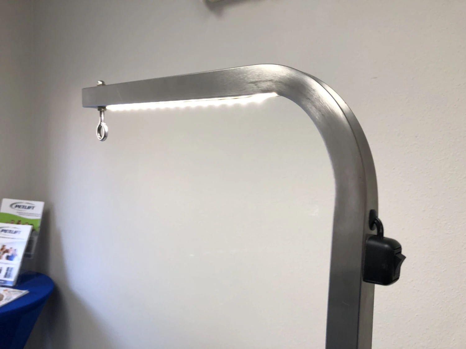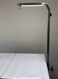 Our heavy-duty clamp has a spring-loaded mechanism that prevents the post from slipping or dropping. This smart system allows one-hand height adjustment while holding the animal with the other. The LED lighted post is fabricated of heavy-duty 1″ square, 14 gauge stainless steel tubing. It is Made to fit all PetLift clamps and brackets. The Cord plugs into any standard wall outlet or your PetLift Electric Grooming Table. It Adjusts in height from 12″ to 40″. Accommodates table tops up to 1 ¼” thick. Stainless steel protection plate included to protect underside wood integrity.
