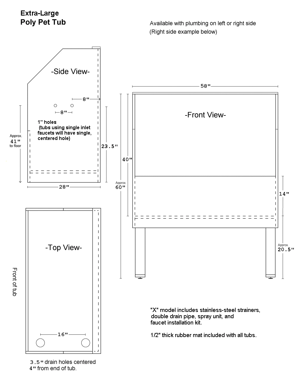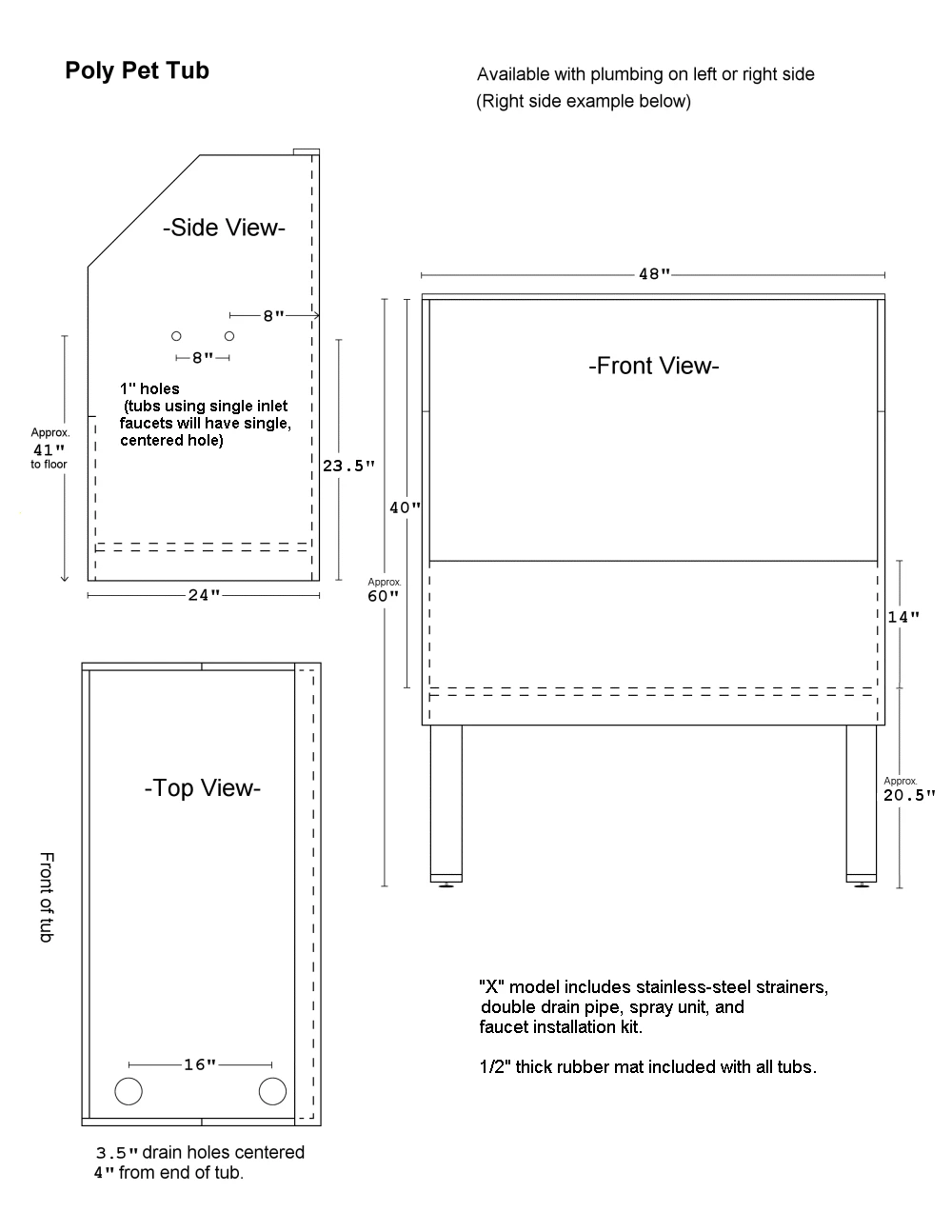 Poly Pet Tubs are constructed from a durable, high-density polyethylene that is a full 1/2″ thick. It is possibly the strongest tub on the market! Similar material is used to make 10,000+ gallon fire truck tanks. They are professional quality tubs that offer an innovative, attractive, practical alternative to stainless steel or other materials.