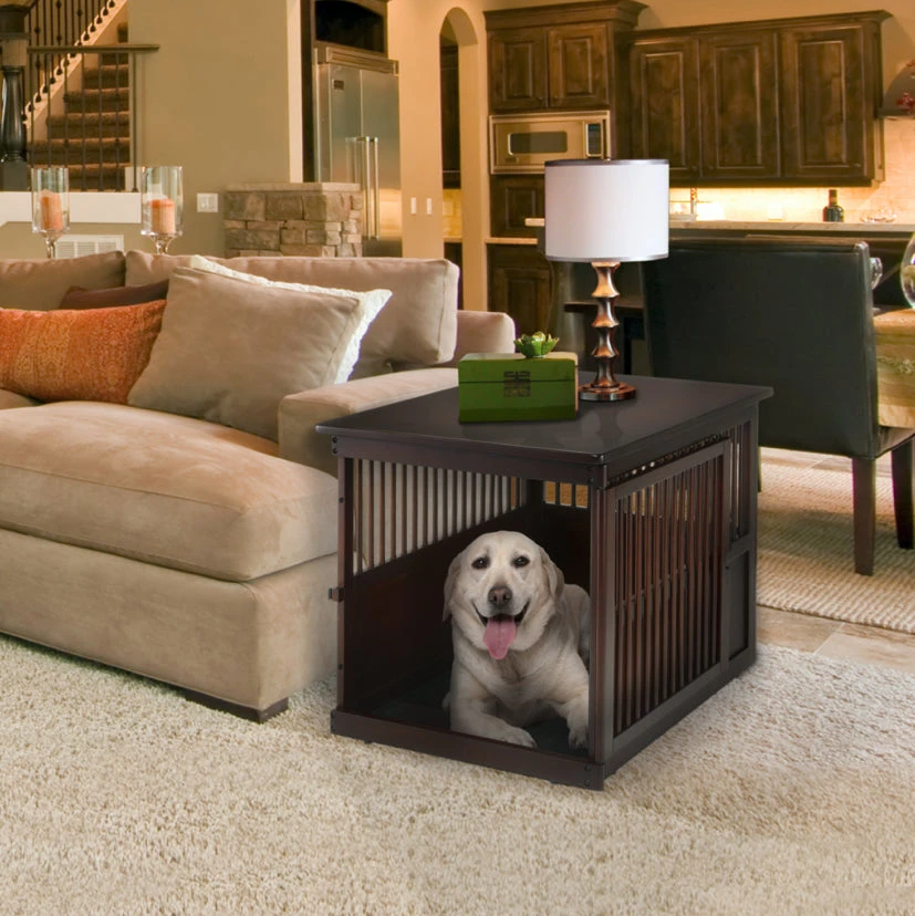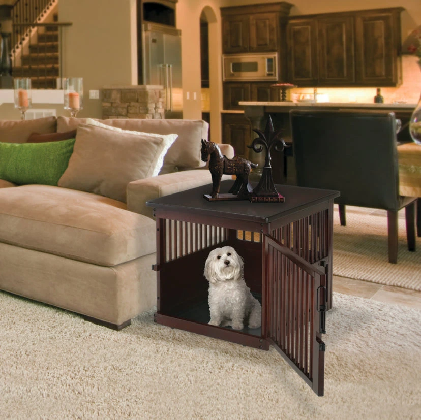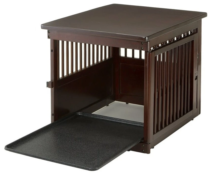 Can your pet share a living room with you? The Wooden End Table makes it possible! It saves space by doubling as a stylish end table as well as a pet containment and leisure space. Multiple vents provide a 360ยฐ view and a well-ventilated environment for your pet. Includes a removable sliding tray for easy cleaning. The door can stay fully open for easy access to your pet and includes a side stopper to keep the door in place. You and your pet will both feel at home and in style with the Wooden End Table Crate.ย