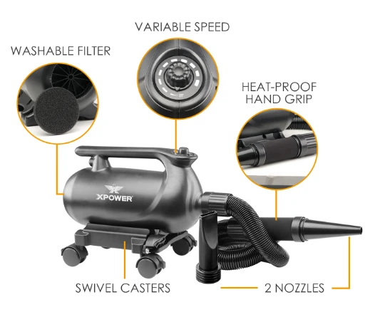 Whether you’re a professional car detailer or a person that appreciates washing and take care of your own sweet ride, we all know the drying process is one of the most important aspects of paint care. Introducing the XPOWER A-16, a powerful and compact mobile solution to automobile drying. Powered by a 6hp dual motor setup that blasts 320 CFM of airflow for a touch-free drying solution. You can control the speed with a variable control knob to dial in the amount of airflow needed. Getting in all the crevices between body panels, window seals, side view mirrors, and between rain channels of your trunk or hood has never been easier with the A-16. The kit includes a Mobile Dock with lockable caster wheels for easy handling. A flexible self-expanding 30ft hose with 2 different attachment nozzles (cone and flat). Rated at 19 amps with a 15ft power cord.